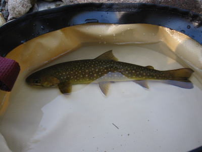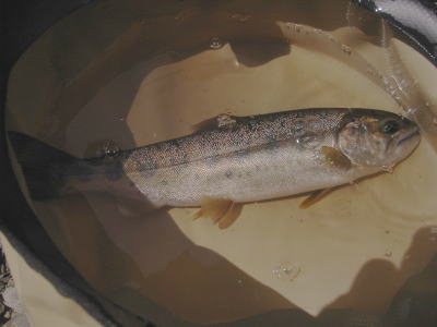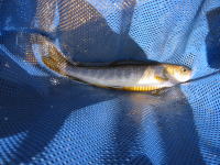 網ですくうとヤマメ。裏磐梯のヤマメらしい、ずんぐりした体高のあるヤマメです。