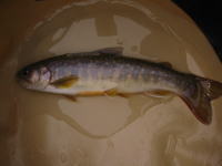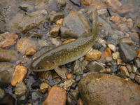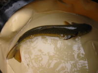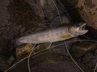 じりじりと探っていくと、大きな石の前でばしゃっと反応。イワナが釣れました。
