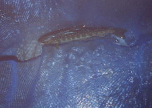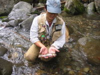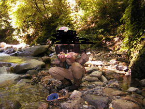 | 今日は尺が釣れそうな予感がする、と言いながら川に行き、 本当に釣ってしまう一美さん。 |
