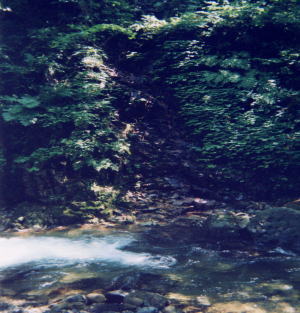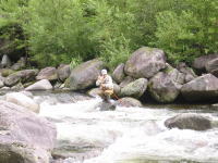 | N川でいい型のイワナを釣る一美さん。 左上がYさん。 |