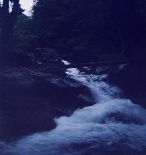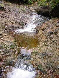 雨足はどんどん強くなり、しばらくして土砂降りになりました。ここは谷が深く、簡単には出ることができません。はあはあ言いながら川をさかのぼります。濁りが入ると川を渡る時に足元が見えなくなってしまいます。雷も鳴り始めました。こわいー