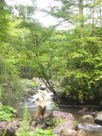 ペンション風来坊で朝食後、一美さんと二人でB沢へ釣りに行きます。