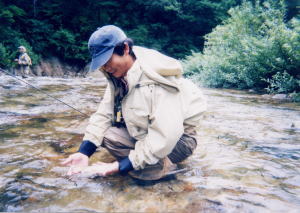 川に出てすぐに一美さんが小さなイワナを釣ります。続いて私のフライにも来ましたが痛恨のバラシ。