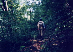 車止めで釣り支度をし、登山道を歩きます。ここのところ運動してないから歩くのは堪えるなあ。登山道から沢伝いに入渓。
