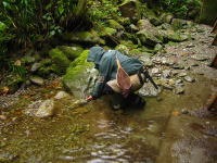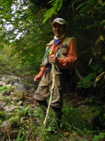 | 鉈を使って杖を作りながらガイドをする名藤さん。 右は岩の下に逃げ込んだイワナを 素手で追う名藤さん。 これもガイドサービスの一環か!? |