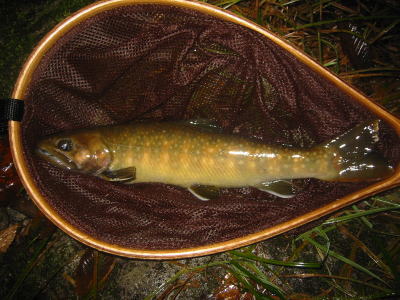 | なかなか大きなイワナ。 名藤さんがストマックポンプで調べると、カゲロウなどの他に 緑色の芋虫を食べていました。 |