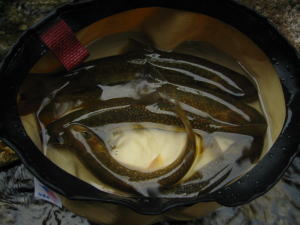 釣れたイワナを洗面器に 次々と放り込んでいたら 少し酸欠気味に。 あわてて浅瀬に放したのが右上の図。 左は一番大きいのを持って喜ぶ私。 |