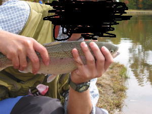 | イワナなどの魚種もいるようですが、 釣れたのはニジマス。 なかなか大きいです。 ドナルドソンでしょうか? この管理釣り場の持ち帰り制限数は50匹! すごいですね。 |