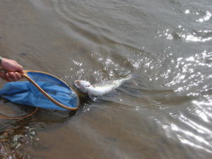 | でかいのを釣って嬉々とするカモノハシ。 2枚とも配偶者撮影。 |