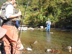 東瀬さんは対岸にフライを流し、ラインにたるみを作ると、フライの流れを一定に保ちながら上流下流と交互にメンディングを入れて見せてくれました。