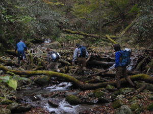 沢を上るタフネスコースの面々 |