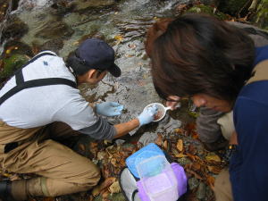 | 死卵をより分けるくりきさん。 けっこうたいへんです。 放流するのは全てヤマメです。 |