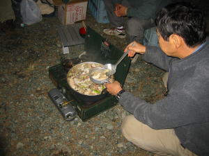 その後はタープを張って鍋を作って懇親会。BOSSさんがだしを作ってきてくれたのでうまいうまい。
