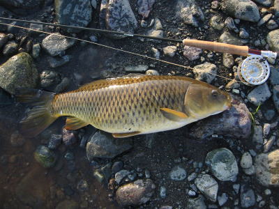 ライズしたところへ行ってフライを投げ込みます。が、コイはフライを食べません。
