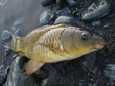 するとばちゃばちゃと下流でライズが始まります。さらにパンを撒き続けると、とうとうコイ達は目の前でパンを食べ始めました。
