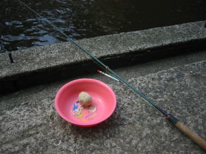おじいさんに料金を払って釣り竿と練り餌をもらいます。