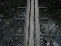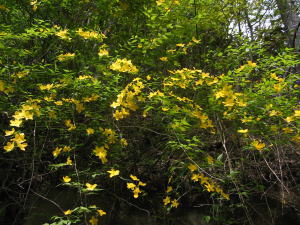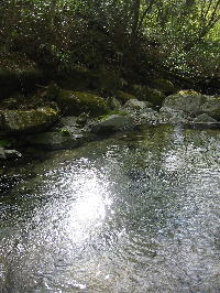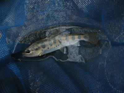 ちょっとおもしろいことが。 しゃがんだまま岩に囲まれた淵を狙ったのですが、 自分の思っていたところと違うスポットで魚が出ました。 しかし魚はフライをくわえず、結局空振り。 フライを上の木の枝に引っ掛けてしまいました。 「ライズ」の名藤さんから「フライの回収はプロ並み(?)」 と評された私ですが、これはしゃがんだ状態でははずせず、 仕方なく立ち上がり枝をがさがさと引き寄せフライを回収。 ティペットがだめになってしまったのでティペットを交換し、 フライを結びなおしました。 これだけそばで動いてしまうと、 魚が警戒して普通そのポイントはもうだめですが、 ものは試しともう一度フライを振り込んでみました。 「これで釣れちゃったりして」 と思っていると本当にヤマメがガバッと出て、 今日一番の大物に(と言っても22〜23センチですが) |