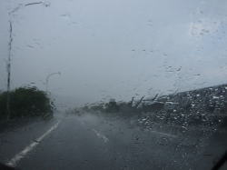 水の深い所では対向車が巻き上げた水が叩きつけられるようにフロントガラスにかぶり、一瞬前が見えなくなります。