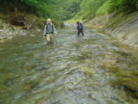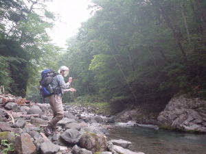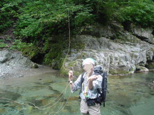 1時間ほど巻いたりへつったり跳び越えたり(!)した後、いよいよ釣り開始です。