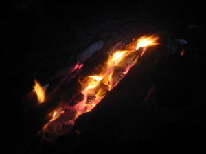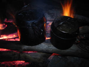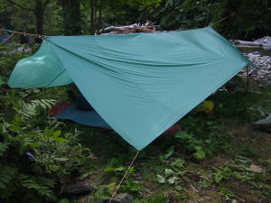 今日のテン場(キャンプをする場所)に到着。タープを張り、焚き火を起こします。