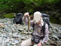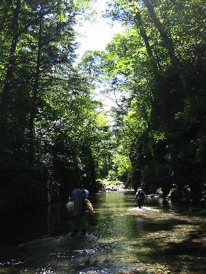 林道を3時間ほど歩いて入渓点に到着。靴下をネオプレーンに替え、スパッツをつけていよいよ川の中へ。