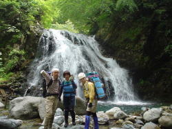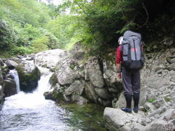 川を遡っていくと大きな滝。どうやって突破するかしばらく考えましたが、三井さんはいったん下流に戻り、高巻くことに決定。