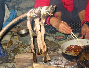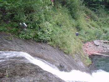 「もうすぐ今日のテン場です。ここで二手に分かれましょう。カモノハシさんはここから竿を出しておかず(イワナ)を釣ってください。
