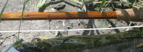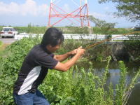 | #4の高太郎ロッドでライギョを釣る高太郎さん。 このロッドで淡水・海水の魚を10種類以上とっています。 なんだかはらはらしますが、しなやかでもパワー抜群のロッドでした。 ちなみにご自宅では奥様が布団を叩くのにバンブーロッドを使っているとか。 次回はヤマメを釣りに来てください、とお誘いをいただきました。 | |