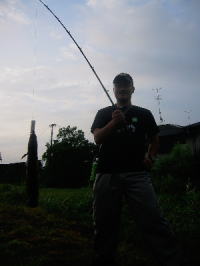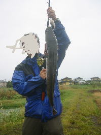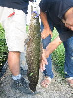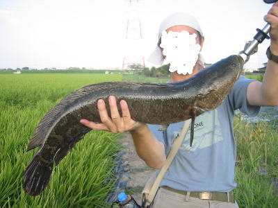引きずり上げると40センチくらいのライギョ。小物ですが初ライギョです。うれしくてうれしくてたまりませんでした。