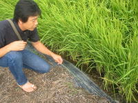 雨が降り始める中、釣り場に到着。幸太郎さんの案内で田んぼのあぜ道を進みます。