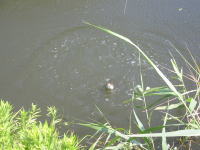 ライギョは水際の地面に置いてやると、自分でずるずると歩いて(?)、水の中に消えました。