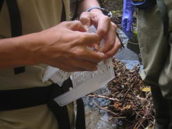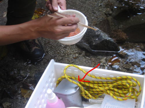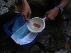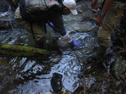 世附川のゲートに8時集合。4グループに分かれ、みんなで卵撒き開始。