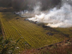 ところが!仕掛けをセットし終わったら妙に目がかすむ。あれっどうしたんだ、と一瞬ひるむが何のことはない、近くの田んぼで焚き火をしているらしく、その煙が川に流れているのだ。ううっ、けむい。釣りどころじゃないよう。