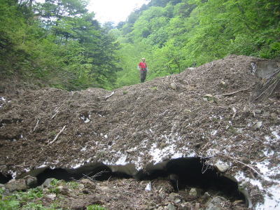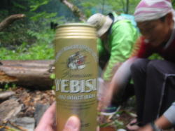 KYさんのザックは、イワナと山菜とタケノコでいっぱい。 ザックが変形するほどである。 私は思わず昨年のBOSSさんを思い出し、「BOSS2号」と命名。 そのことを教えると三井さんが喜ぶ。 しかし、その後、KYさんのザックには魚肉ソーセージなどが さらにストックされていることが判明。 「歩くスーパーマーケット」と改名する。 |