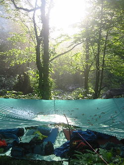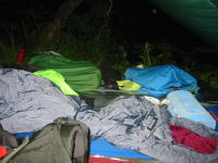 今回はスリーシーズン用羽毛シュラフとシュラフカバーを使用。 寝るときの服装は上は長袖シャツにTシャツ、下は薄いフリースのズボン。 これでちょっと暑すぎるくらいだった。 サマーシュラフでちょうど良かったかも。 フリースは不要でしたね。 |