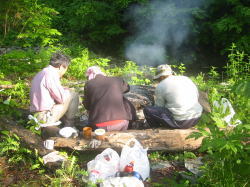 三井さんが夕食の支度をする間、IHさんはテン場の前で釣りを始める。1つのポイントで15匹くらい釣れたそうだ。