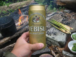 三井さんが茹でてくれた山菜と、焚き火で焼いたネマガリダケを肴にビールを飲む。