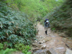 帰りは往きの逆になるわけだ。この険しい沢を上り、急な山道を下らなければならない。