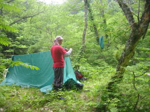 山菜とネマガリダケをたっぷり採って本流に到着。少し下ってからテン場を確保する。