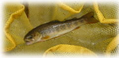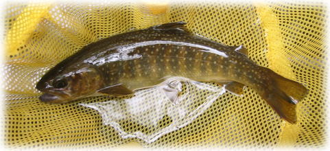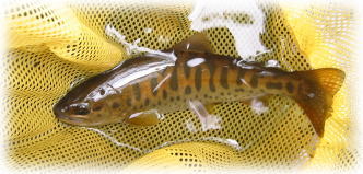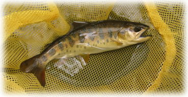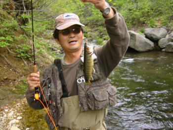 ここもなかなか反応がなかったが、一美さんが橋げた横のたるみでダッピング(毛鉤のちょうちん釣り)を試みると、がぼっと音を立ててイワナが飛び出した。まるでびっくり箱だ。