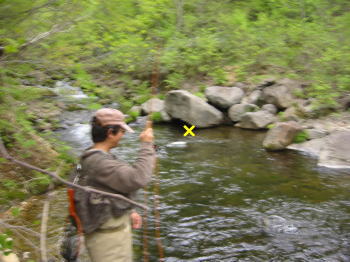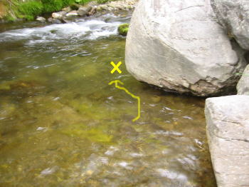 対岸の岩の下が反転流になっていることを読み、