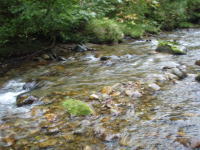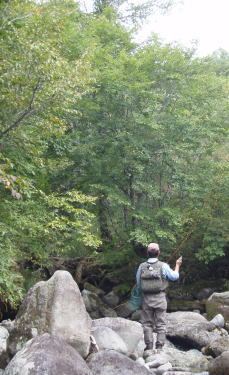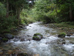 R川はずいぶん山奥だが、あまり落差のないフラットな流れ。フライフィッシング向きである。