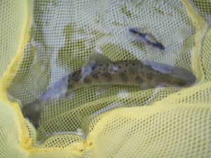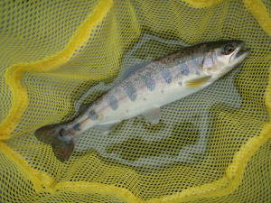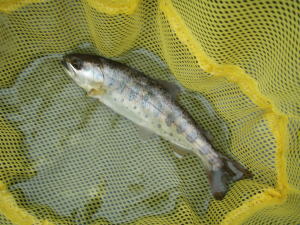 ルアーをミノーに変えて再度キャスト。今度はばっちりで、ヤマメとニジマスが釣れる。