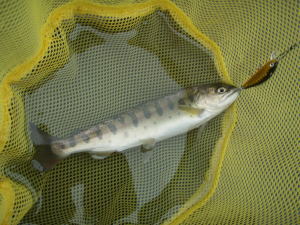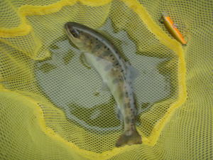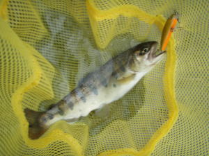 流れを横切らせて引いてみるとぶるぶるっとあたり。ヤマメだ。メリメリの放流モノだが、ルアーでヤマメを釣ったのは初めて。うれしい限りだ。