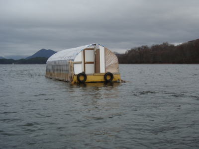 今日の桧原湖は強風だ。ドーム船がざっぱんざっぱん揺れる。一美さんによるとこの場所は東風に弱いのだそうだ。