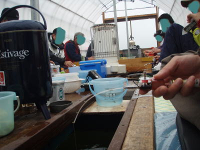 ドーム船に入ってみるとすでにみなさんガンガンに釣っている。私も一美さんから竿を借り受け、釣り方を教わる。