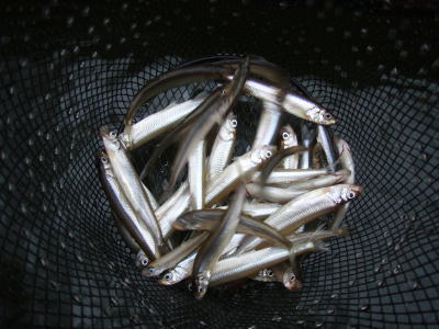 ワカサギは群れで行動しているので釣れ始めるとみんながザッパザッパと釣る。でも私はすべてのあたりがとれるわけではないので「ザ」くらいである。なかなか数が伸びない。