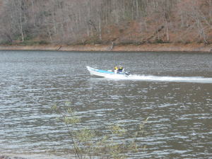 おやど風来坊の一美さんに言われたとおり桧原湖を右手に見ながら走っていくと、数台の車が止まっている場所があった。湖岸に停泊しているボートのそばで一美さんが手を振っている。