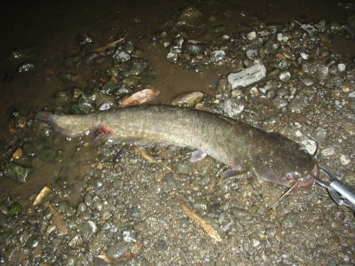 流れのゆるいところにジッターバグを放り込むと、まるで予測していたかのようにばしゅっとナマズが襲いかかった。ラインが動き出すのを待って竿を立てるとヒット!
