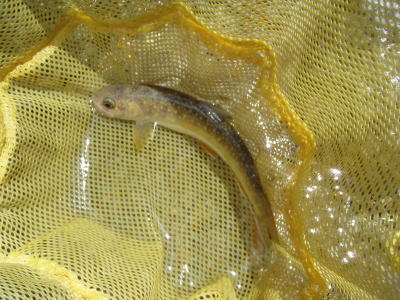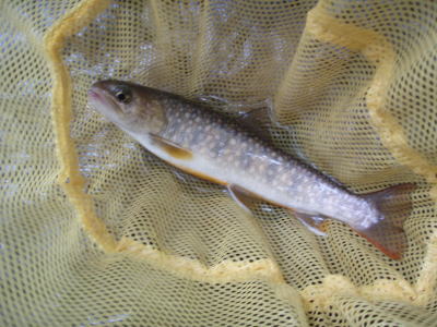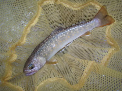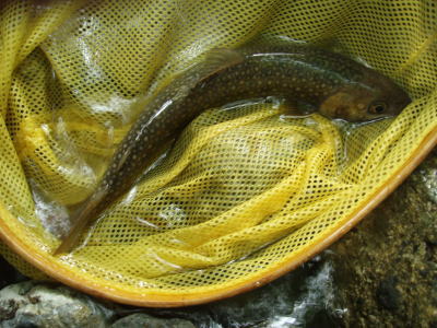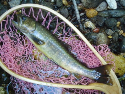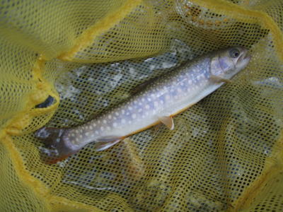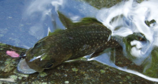 どうかなあと思いながらフライを投げると、ものすごく浅いところでイワナがフライを咥えた。合わせるとがっちりフッキング。